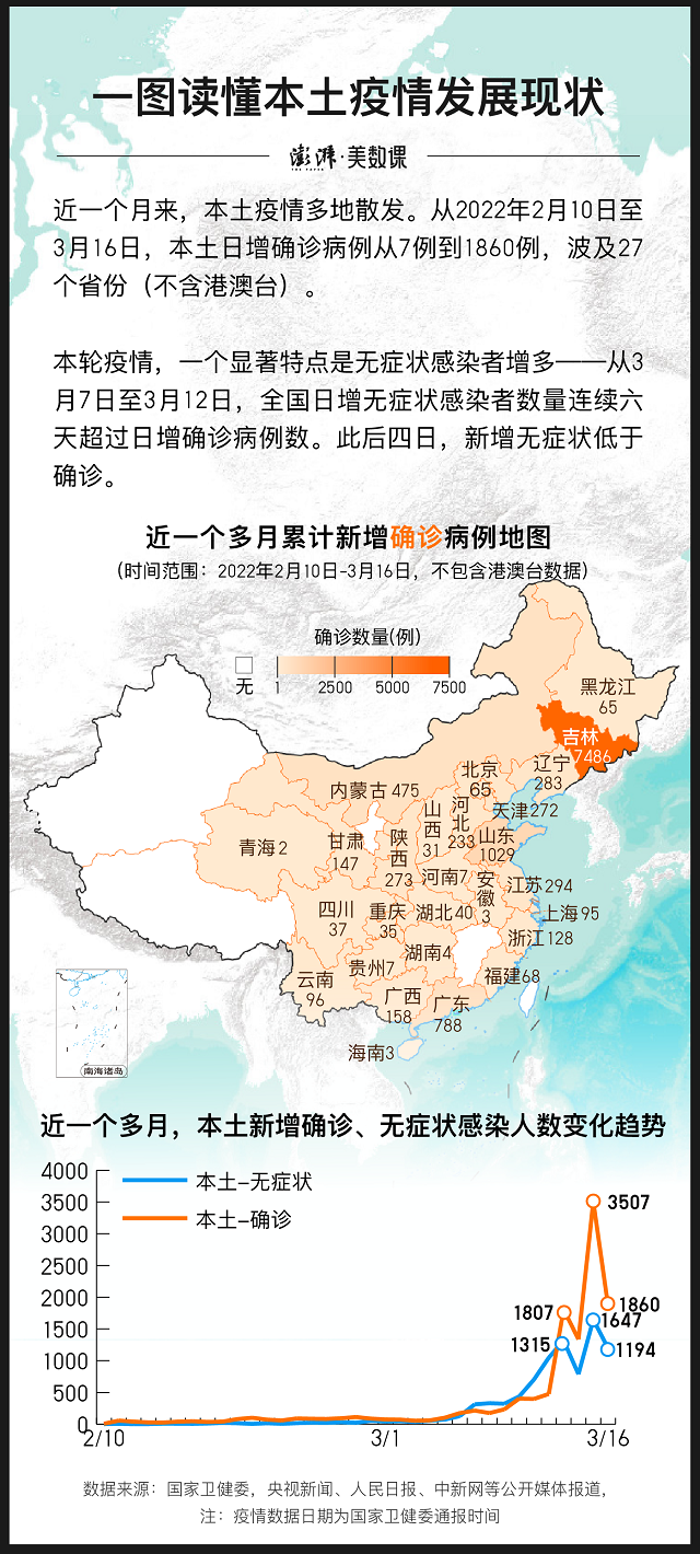 来源: 澎湃新闻 作者:澎湃视觉 陈志芳 晁嘉笙 王亚赛近一个月来,本土疫情多地散发。从2022年2月10日至3月16日,本土日增确诊病例从7例到1860例,波及27个省份(不含港澳台)。